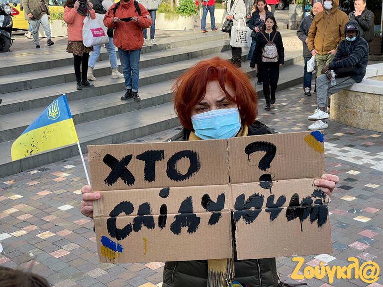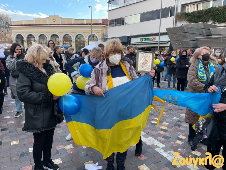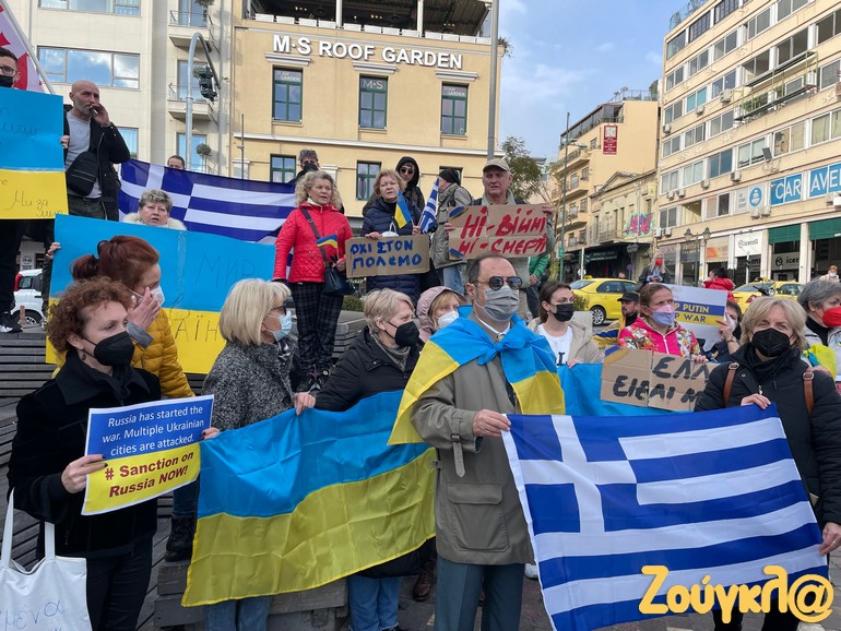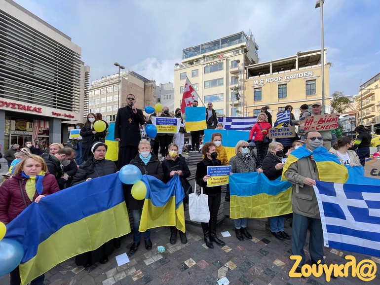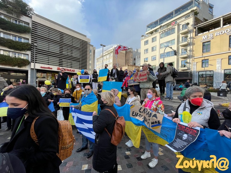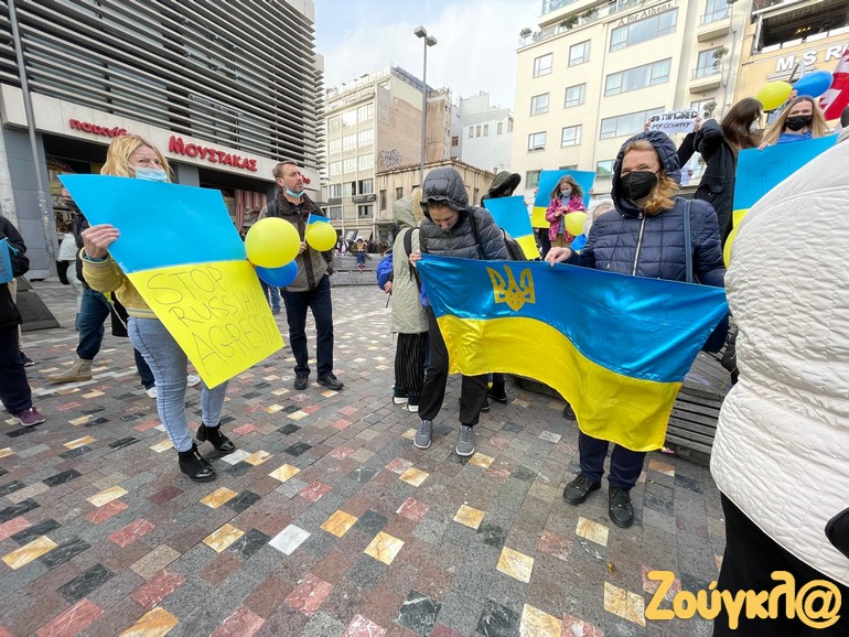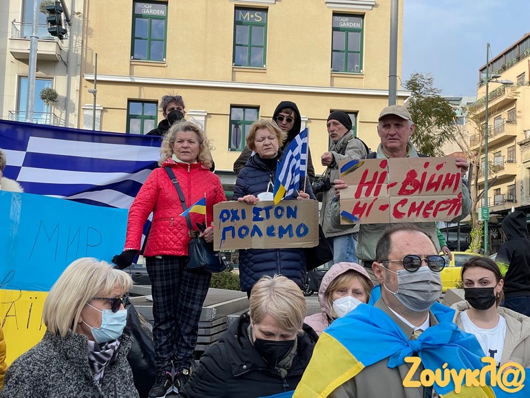 Οι Ουκρανοί πολίτες που συγκεντρώθηκαν κρατούν πλακάτ με συνθήματα κατά του πολέμου, αλλά και κατά του Βλαντιμίρ Πούτιν, όπως και σημαίες της Ουκρανίας και της Ελλάδας.