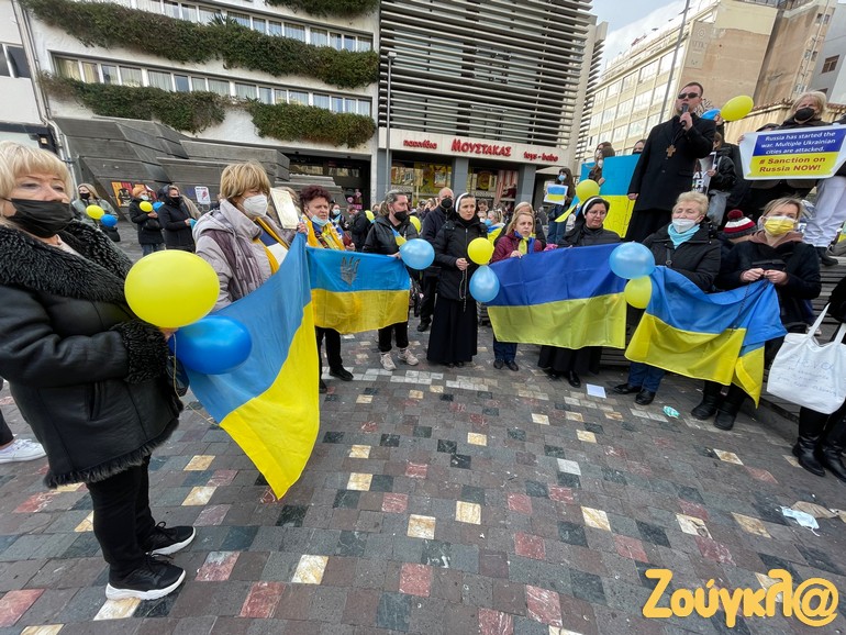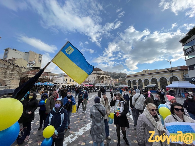 Συγκέντρωση πραγματοποιούν αυτή την ώρα στο Μοναστηράκι Ουκρανοί πολίτες διαδηλώνοντας κατά της ρωσικής εισβολής στην Ουκρανία που ξεκίνησε από τα ξημερώματα της Πέμπτης.