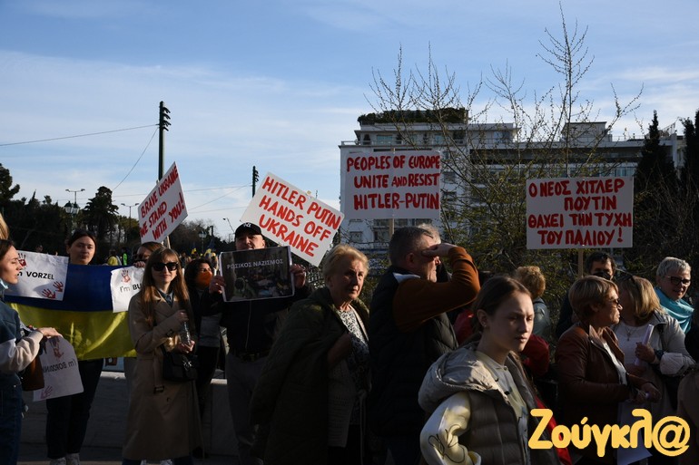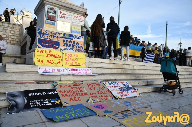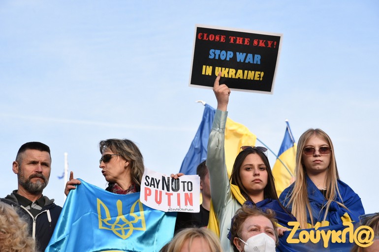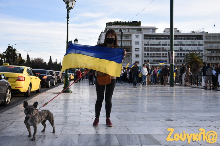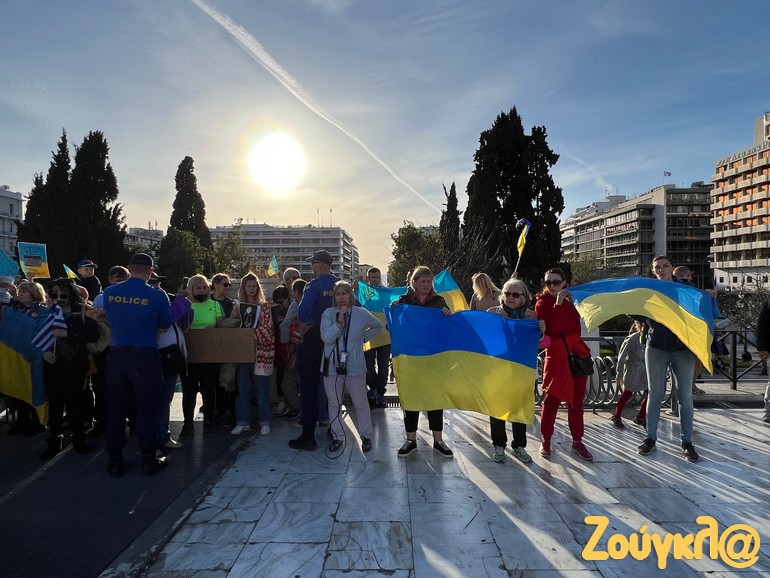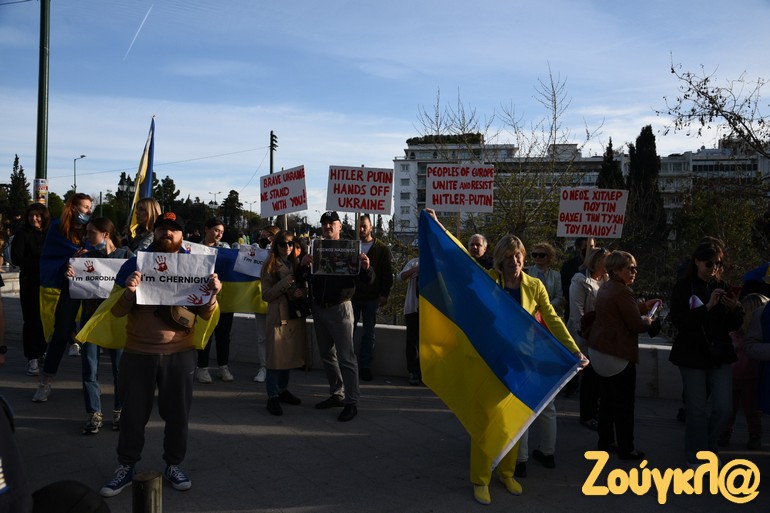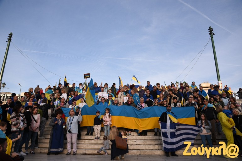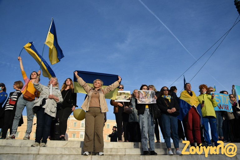 Συγκέντρωση πραγματοποίησαν το απόγευμα της Κυριακής στο Σύνταγμα Ουκρανοί για να διαμαρτυρηθούν για τον πόλεμο στη χώρα τους.
