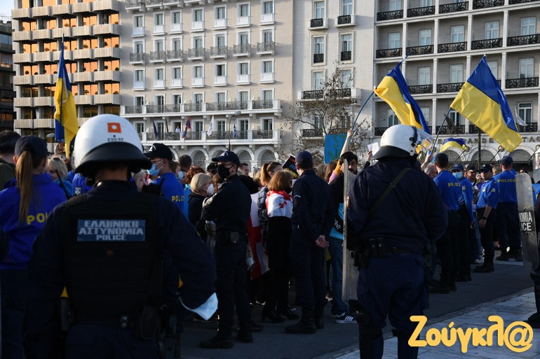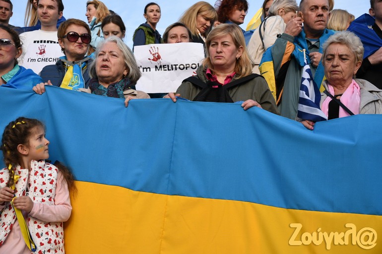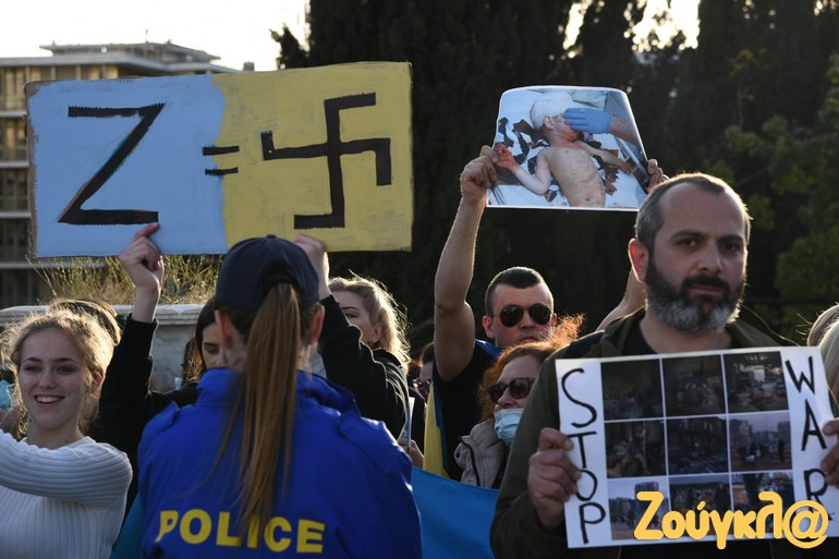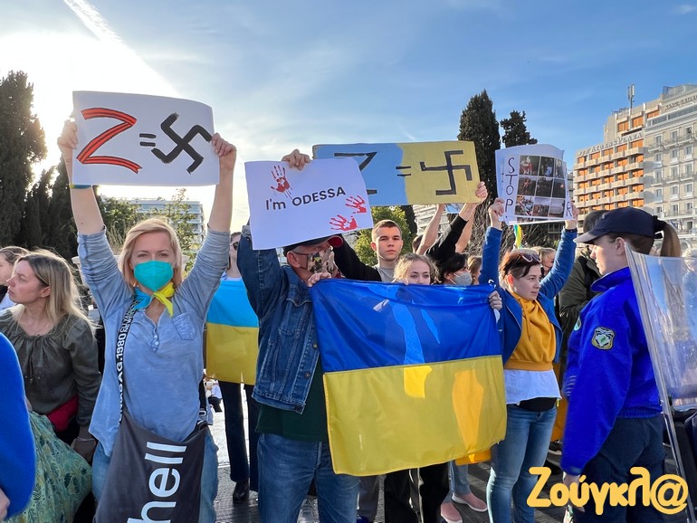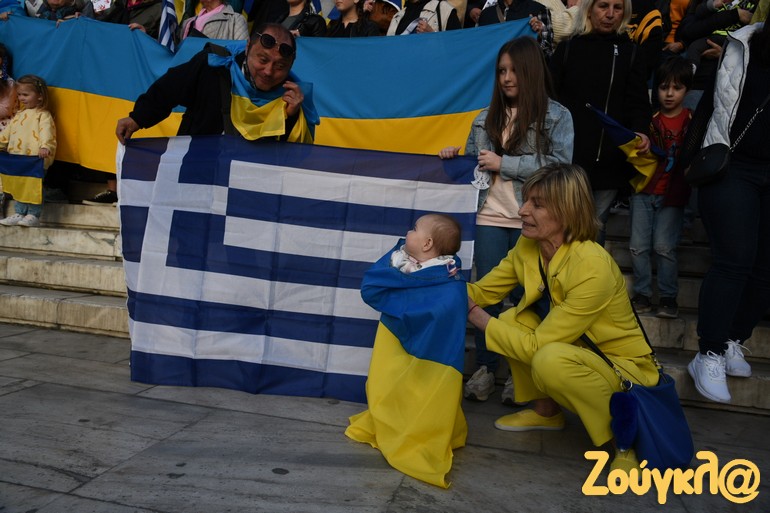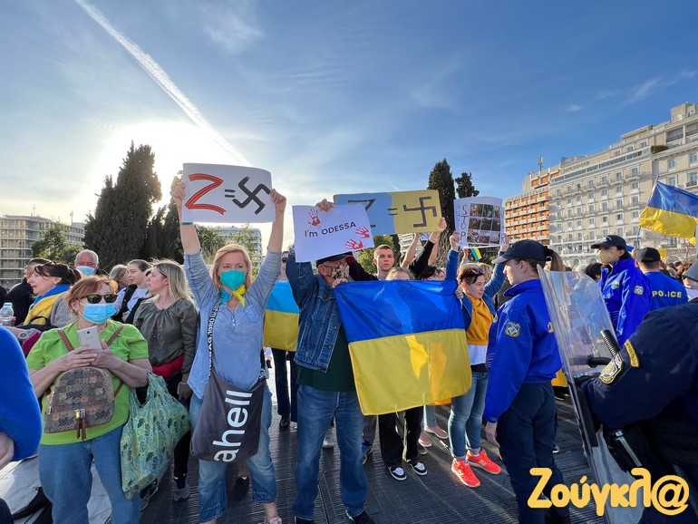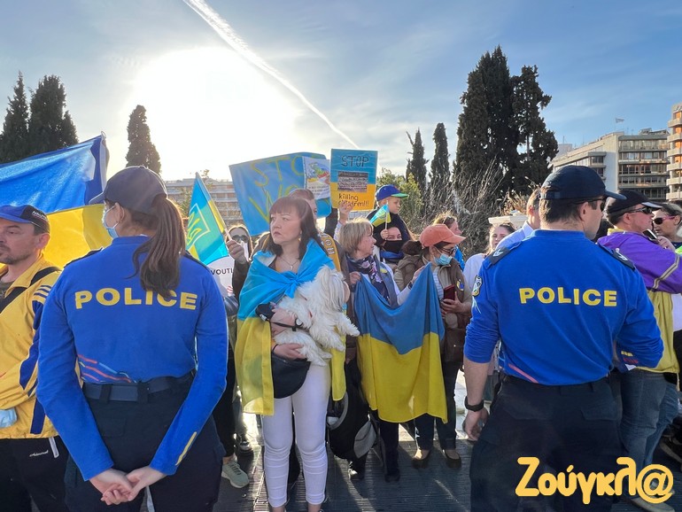 Συγκέντρωση πραγματοποίησαν το απόγευμα της Κυριακής στο Σύνταγμα Ουκρανοί για να διαμαρτυρηθούν για τον πόλεμο στη χώρα τους.