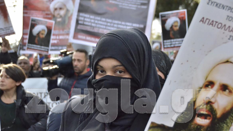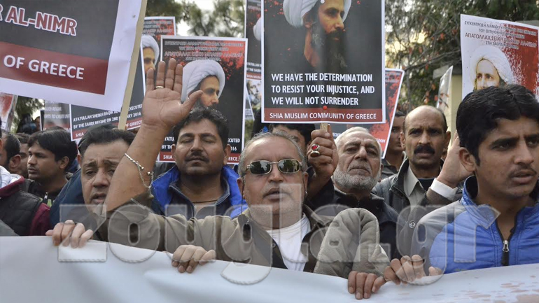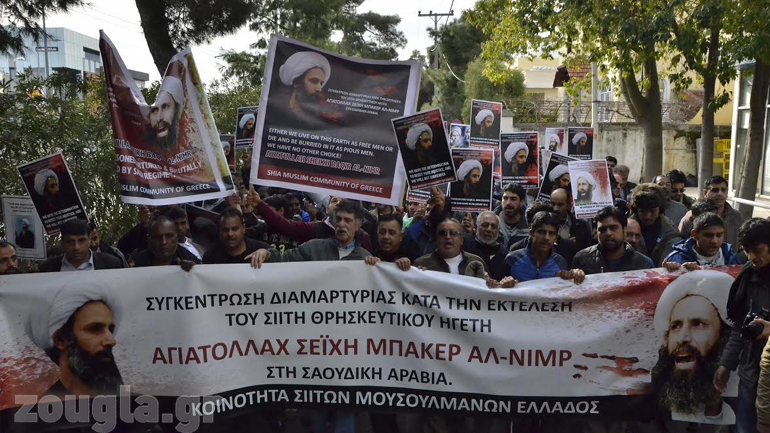 Έξω από την πρεσβεία της Σαουδικής Αραβίας, στο Ψυχικό, διαδηλώνουν δεκάδες Σιίτες διαμαρτυρόμενοι για τον θάνατο του Αγιατολλάχ Σεΐχη Μπάκερ Αλ Νεμρ.