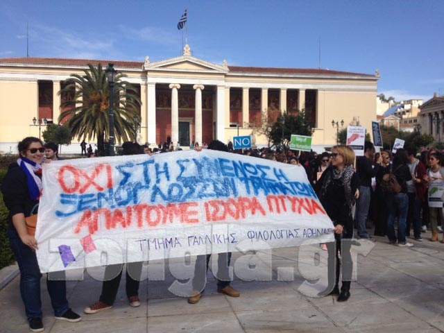 Συγκέντρωση διαμαρτυρίας πραγματοποιούν αυτή την ώρα στα Προπύλαια φοιτητές του τμήματος Φιλοσοφίας, Παιδαγωγικής και Ψυχολογίας καθώς και φοιτητές των τμημάτων Αγγλικών, Γαλλικών, Σλαβικών και Γερμανικών σπουδών, κατά της εφαρμογής του σχεδίου «Αθηνά».