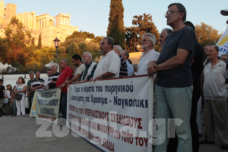 Με το σύνθημα «Δυναμώνουμε τον αγώνα ενάντια στον πόλεμο, τη φτώχεια και τις νέες πυρηνικές απειλές» η Ελληνική Επιτροπή για τη Διεθνή Ύφεση και Ειρήνη πραγματοποίησε συγκέντρωση στον Ιερό Βράχο της Ακρόπολης για τα 74 χρόνια από τη ρήψη πυρηνικών βομβών από τις ΗΠΑ σε Χιροσίμα και το Ναγκασάκι.