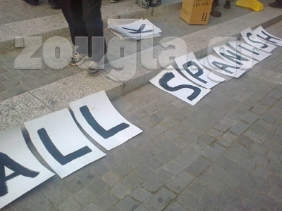 Ακούστηκαν συνθήματα αλληλεγγύης προς τον ισπανικό λαό και ενάντια της Ε.Ε., καθώς και του μνημονίου.