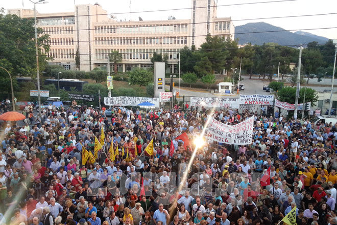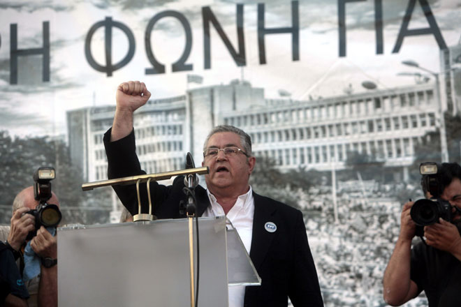 O Δ. Κουτσούμπας κατά τον χαιρετισμό του εξαπέλυσε επίθεση στην κυβέρνηση και στις πολιτικές που εφαρμόζονται από την Ευρωπαϊκή Ένωση. Με αφορμή τη συμπλήρωση ενός χρόνου από το «λουκέτο» στην ΕΡΤ, ο γενικός γραμματέας του Κομμουνιστικού Κόμματος Ελλάδας εξέφρασε τη στήριξή τους στους εργαζομένους της ΕΡΤ και ζήτησε την επαπρόσληψή τους. Στην ομιλία του, ο γγ του ΚΚΕ αναφέρθηκε και στον αγώνα των απολυμένων καθαριστριών όπως και σε αυτόν των σχολικών φυλάκων.