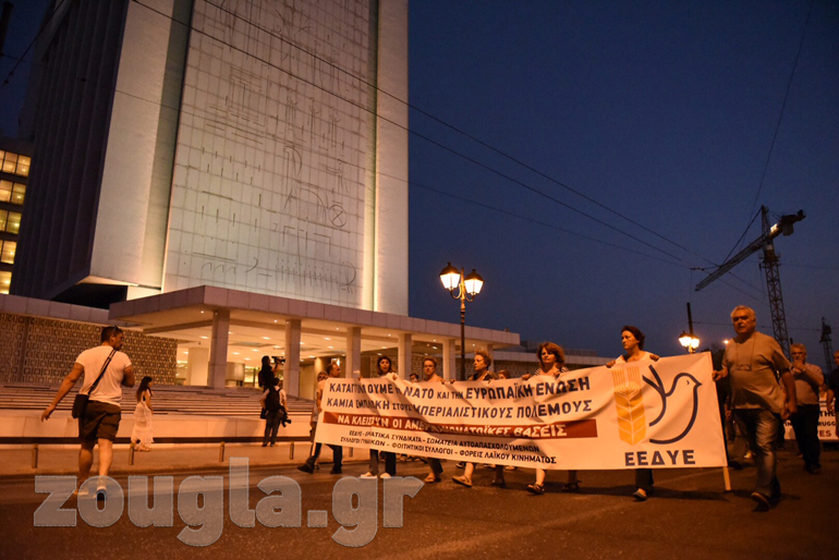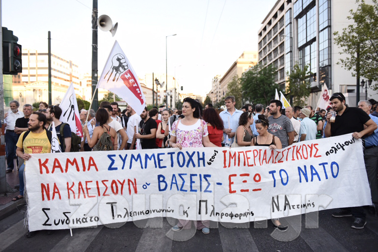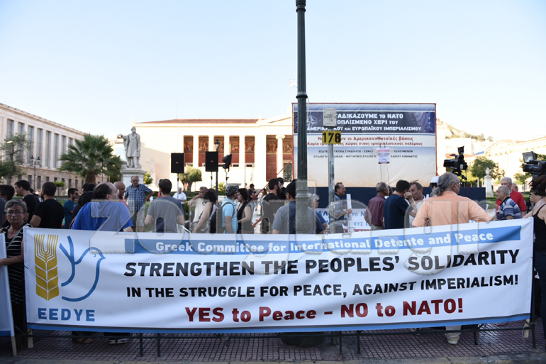 Συγκέντρωση στα Προπύλαια και πορεία στην αμερικάνικη πρεσβεία πραγματοποίησαν το βράδυ της Πέμπτης η Ελληνική Επιτροπή Διεθνούς Ύφεσης και Ειρήνης (ΕΕΔΥΕ) και φορείς του εργατικού και λαϊκού κινήματος, εργατικά συνδικάτα, σωματεία αυτοαπασχολούμενων, σύλλογοι γυναικών, φοιτητικοί και σπουδαστικοί σύλλογοι, με αφορμή τη Σύνοδο Κορυφής του ΝΑΤΟ που πραγματοποιείται στις 8 και 9 Ιουλίου στη Βαρσοβία.