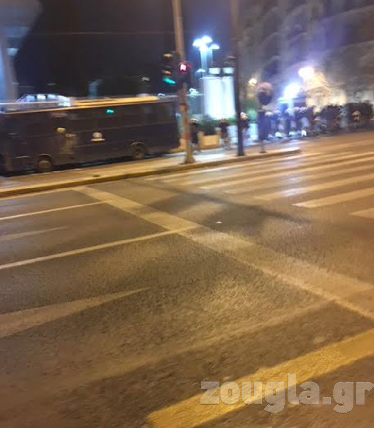 Κλούβες των ΜΑΤ είχαν αποκλείσει τη Μεσογείων ώστε να μην συναντηθούν οι δυο πορείες ενώ επίσης κλούβες βρίσκονταν Αμερικανική πρεσβεία.