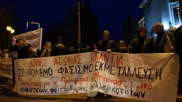 Παράλληλα, αριστερές, αντιφασιστές οργανώσεις και αντιεξουσιαστές συγκεντρώθηκαν στη Ρηγίλλης στις 18.00. Στις 19.00 ξεκίνησαν πορεία με κατεύθυνση τα γραφεία της Χρυσής Αυγής αλλά δεν κατάφεραν να την ολοκλήρωσουν λόγω των μπλόκων που είχαν στήσει στα ΜΑΤ και έτσι αποχώρησαν.