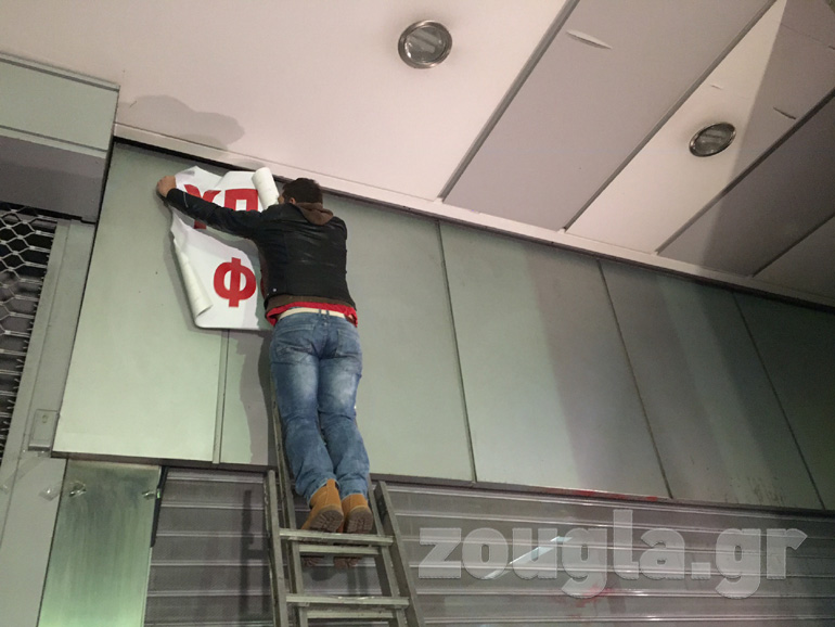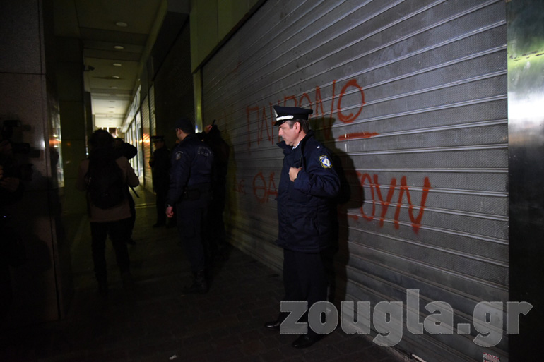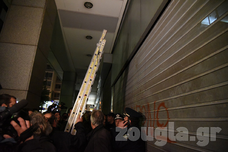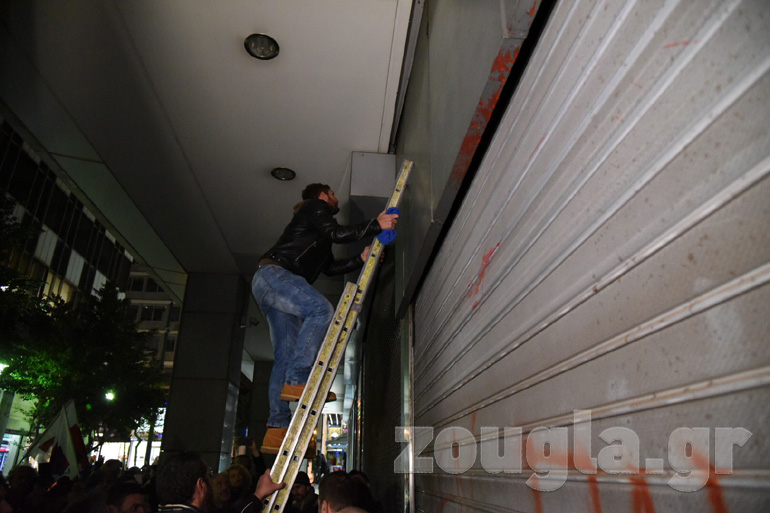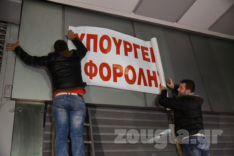 Οι διαδηλωτές έφτασαν έξω από το Υπουργείο και υπό το βλέμμα των αστυνομικών, σκαρφάλωσαν σε μία σκάλα που έφεραν μαζί τους και ανάρτησαν πανό πάνω από την είσοδο του κτηρίου, αλλάζοντας συμβολικά το όνομά του σε «Υπουργείο Πλειστηριασμών Φοροληστείας και Χαρατσιών».