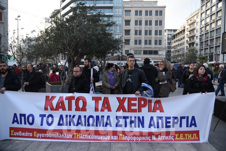 Στη συνέχεια ανέβηκαν στην ταράτσα του υπουργείου, όπου κρέμασαν ένα μεγάλο πανό, διαμαρτυρόμενοι για τις αλλαγές που προωθεί η κυβέρνηση σχετικά με το δικαίωμα στην απεργία.
