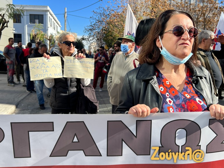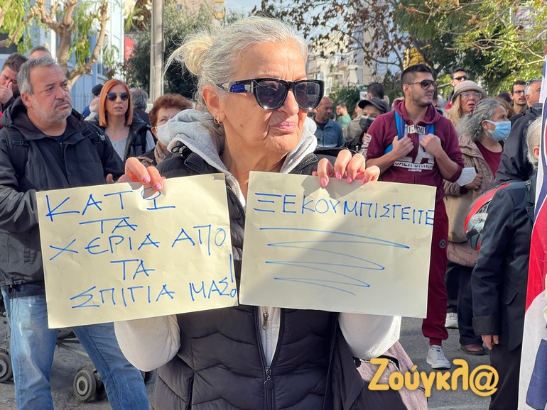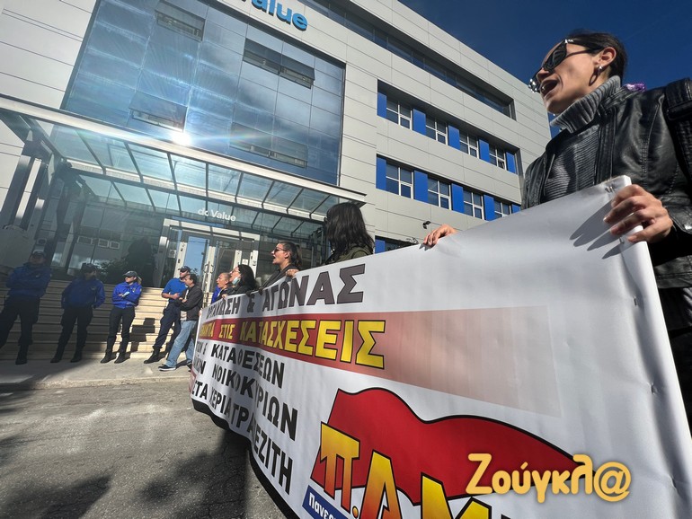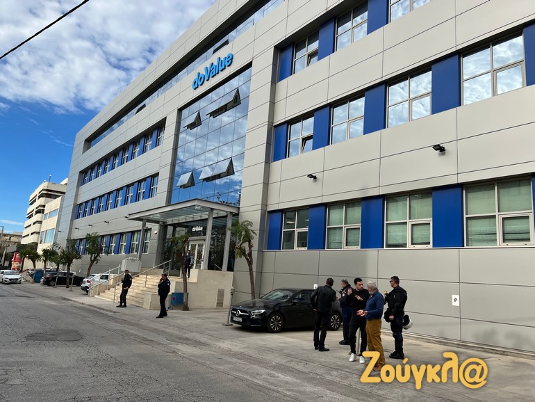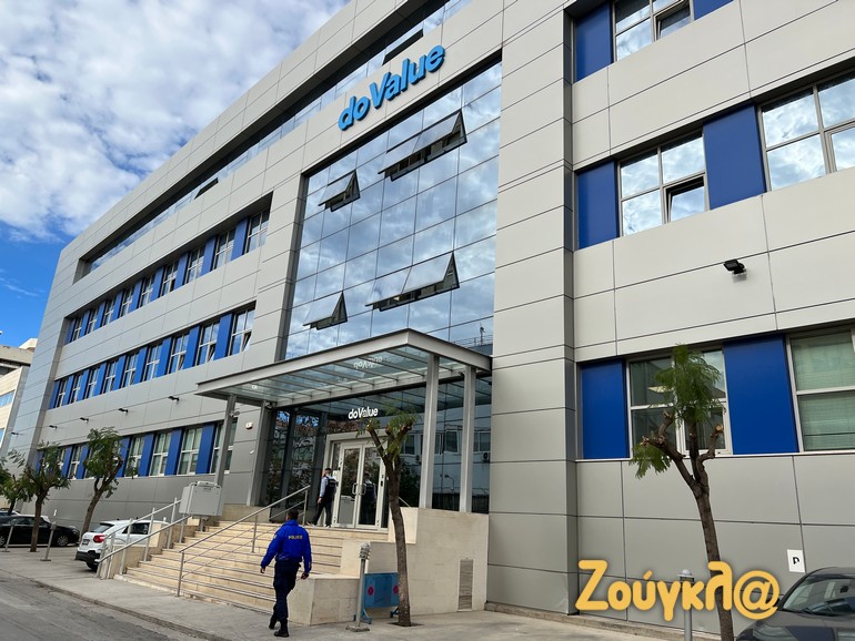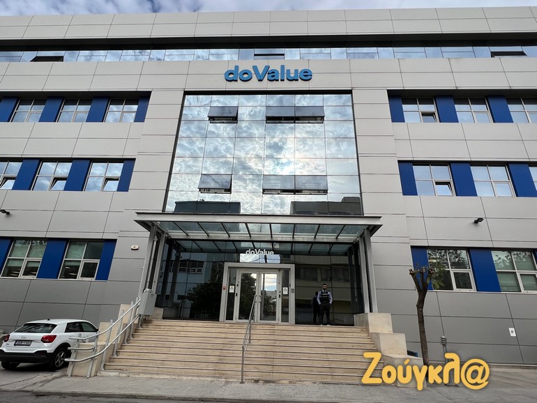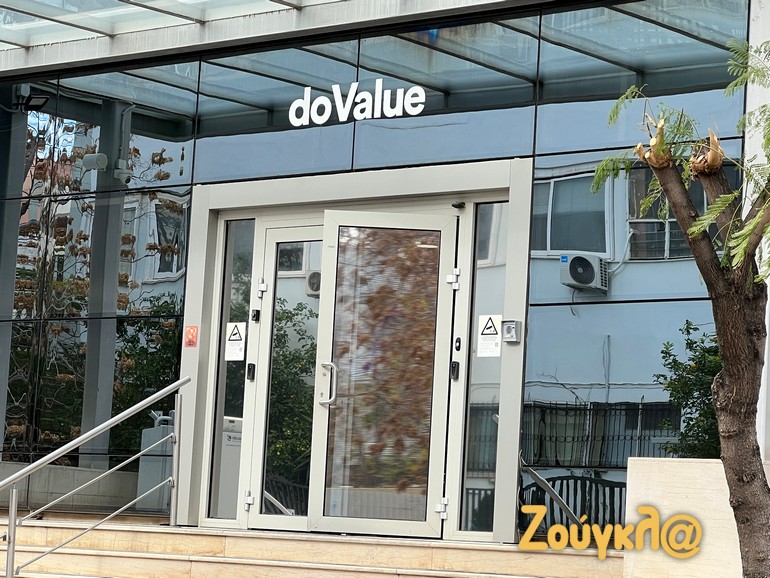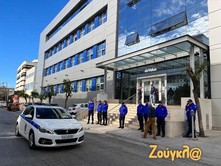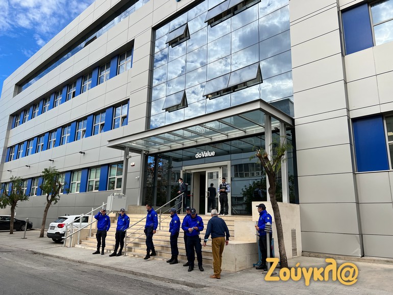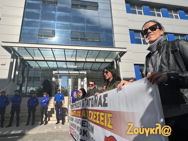 Συγκεκριμένα, οι διαδηλωτές έχουν συγκεντρωθεί έξω από τα γραφεία της εταιρείας διαχείρισης «κόκκινων» δανείων «do Value», φέροντας πανό.