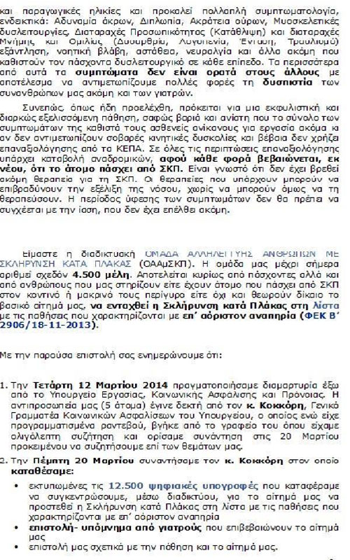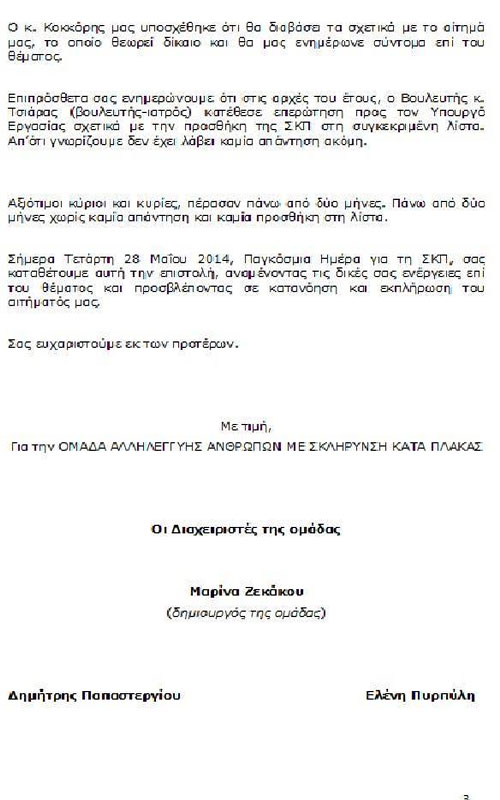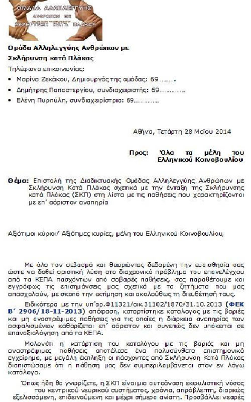 Παράλληλα, με αφορμή την Παγκόσμια Ημέρα για τη Σκλήρυνση Κατά Πλάκας απέστειλαν επιστολή σε όλους τους βουλευτές: