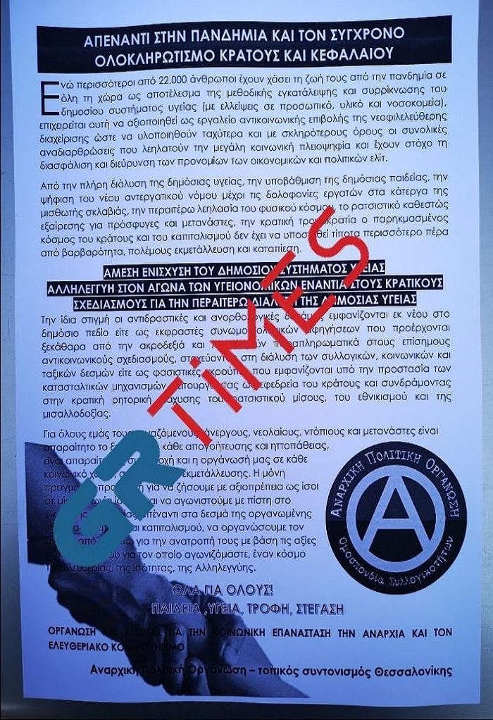 Οι συγκεντρωμένοι, μέλη αναρχικών οργανώσεων και συλλογικοτήτων της Θεσσαλονίκης, καταγγέλλουν την μεθοδική εγκατάλειψη και συρρίκνωση του δημόσιου συστήματος υγείας, όπως χαρακτηριστικά λένε, κατάσταση που επιχειρείται να αξιοποιηθεί “ως εργαλείο αντικοινωνικής επιβολής της νεοφιλελεύθερης διαχείρισης, ώστε να υλοποιηθούν ταχύτερα και με σκληρότερους όρους οι συνολικές αναδιαρθρώσεις που λεηλατούν τη μεγάλη κοινωνική πλειοψηφία και έχουν στόχο τη διασφάλιση και διεύρυνση των προνομίων των οικονομικών και πολιτικών ελίτ”.