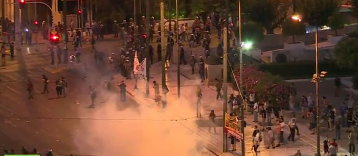 Επεισόδια σημειώθηκαν το βράδυ της Τετάρτης στο κέντρο της Αθήνας, όπου διοργανώθηκαν συγκεντρώσεις ενάντια στα μέτρα που αναμενόταν να ψηφιστούν στη Βουλή, με βάση τη συμφωνία στη Σύνοδο Κορυφής της περασμένης Κυριακής.