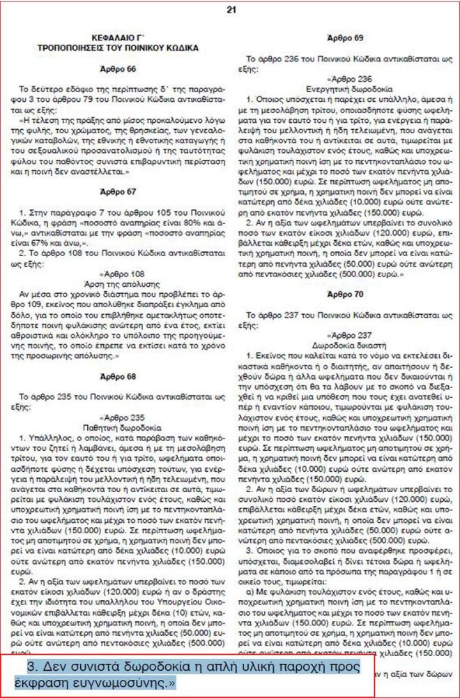 Από την ενδελεχή μελέτη του προέκυψε ότι με το άρθρο 68 παράγραφο 3 οι νομοθέτες φρόντισαν να «κοντύνουν» ακόμη περισσότερο την ηθικά παρηκμασμένη και οικονομικά «τσακισμένη» Ελλάδα, καθώς νομιμοποίησαν τη δωροδοκία! Το συγκεκριμένο άρθρο αναφέρει χαρακτηριστικά ότι «δεν συνιστά δωροδοκία η απλή υλική παροχή προς έκφραση ευγνωμοσύνης».