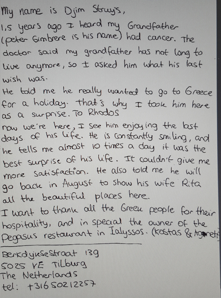 Ο 75χρονος Ολλανδός, εκμυστηρεύτηκε στον εγγονό του, ότι αυτό που θα ήθελε πάρα πολύ ήταν να έρθει στην Ελλάδα και τη Ρόδο για να περάσει τις διακοπές του.