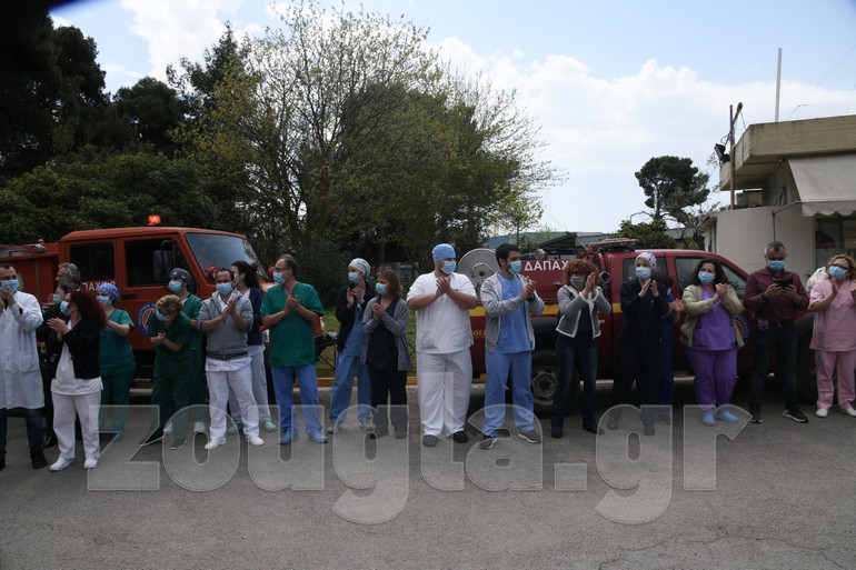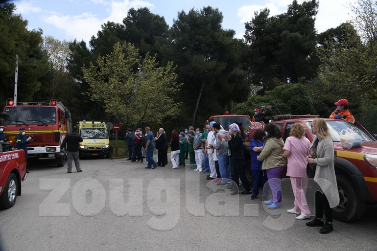 Όπως θα δείτε στα βίντεο και τις φωτογραφίες του zougla.gr, πυροσβεστικά οχήματα έφτασαν λίγο μετά τις 14:00 το μεσημέρι έξω από το νοσοκομείο βάζοντας σε λειτουργία τις σειρήνες και με χειροκροτήματα έστειλαν ένα μεγάλο «ευχαριστώ» στους εργαζόμενους.