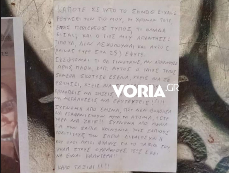 «Κάποτε σε αυτό το σημείο είχε ρωτήσει τον γιο μου, 14 χρόνων τότε, ένας περίεργος τύπος, περίπου 25 ετών, “τι ομάδα είσαι;”. Ο γιος μου απάντησε “τίποτα, δεν ασχολούμαι” και αυτός έφυγε. Σκέφτομαι τι θα γινότανε αν απαντούσε Άρης, ΠΑΟΚ κ.λπ. Αυτός ο ίδιος τύπος σήμερα σκότωσε εσένα χωρίς να σε ρωτήσει, χωρίς να σε ξέρει, πριν προλάβεις να ζήσεις, να ονειρευτείς, να μεγαλώσεις, να ερωτευτείς!!! Συγγνώμη από εμένα που δεν βοήθησα να εξαφανιστούν αυτά τα άτομα, ώστε τώρα να ζεις! Συγγνώμη από μένα για τη σάπια κοινωνία, τους σάπιους πολιτικούς, τη σάπια Δικαιοσύνη, που όλοι αυτοί φταίνε για το ταξίδι σου ψηλά στους ουρανούς. Ίσως εκεί να είναι καλύτερα» έγραφε το σημείωμα…
