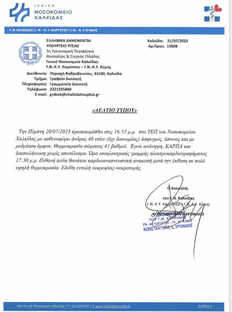 «Το Εργατικό Κέντρο Εύβοιας εκφράζει τα θερμά του συλλυπητήρια στην οικογένεια του συναδέλφου που έχασε τη ζωή του εχθές στη Χαλκίδα μετά τη διακομιδή του στο Νοσοκομείο με συμπτώματα θερμοπληξίας.