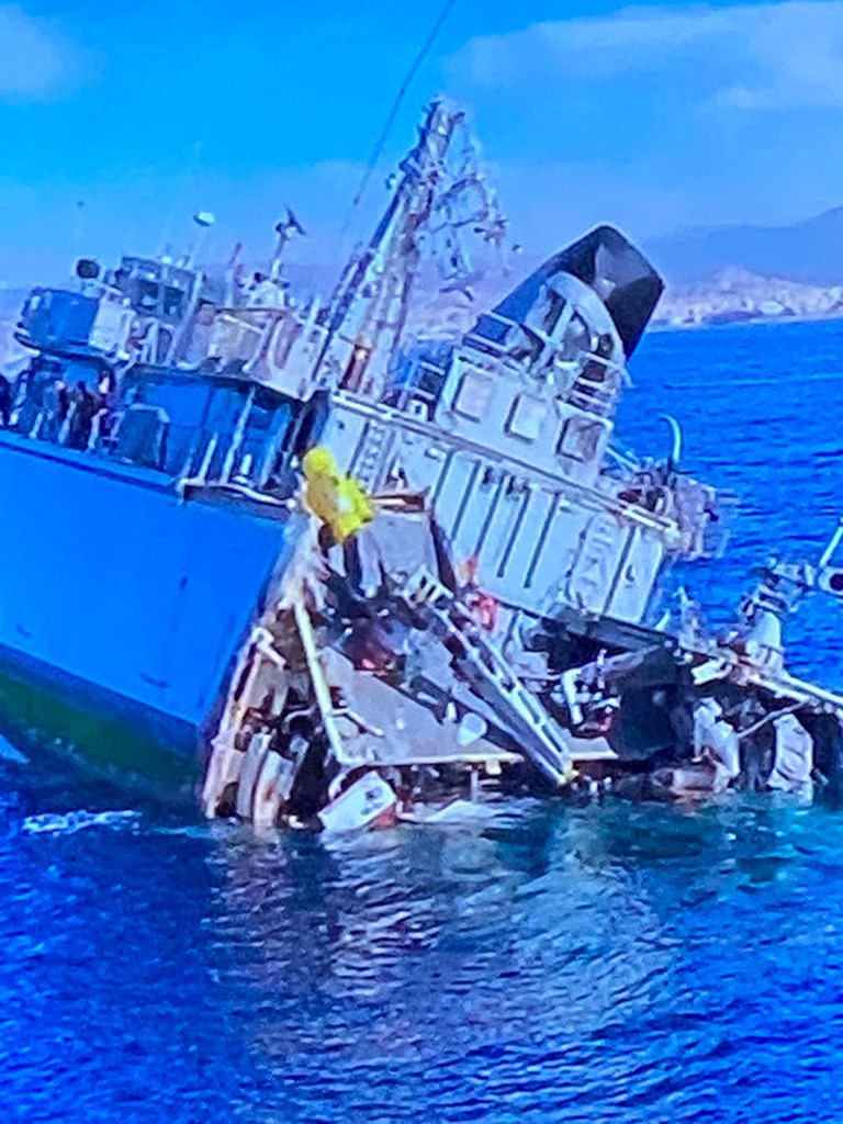Πληροφορίες επίσης αναφέρουν πως το πολεμικό πλοίο έχει 27 άτομα πλήρωμα τα οποία μεταφέρθηκαν με σκάφη. Ακόμα τα πλοία του λιμενικού έχουν προχωρήσει στην περισυλλογή 2 ατόμων από τη θάλασσα, τα οποία έχουν τραυματιστεί ελαφρά.