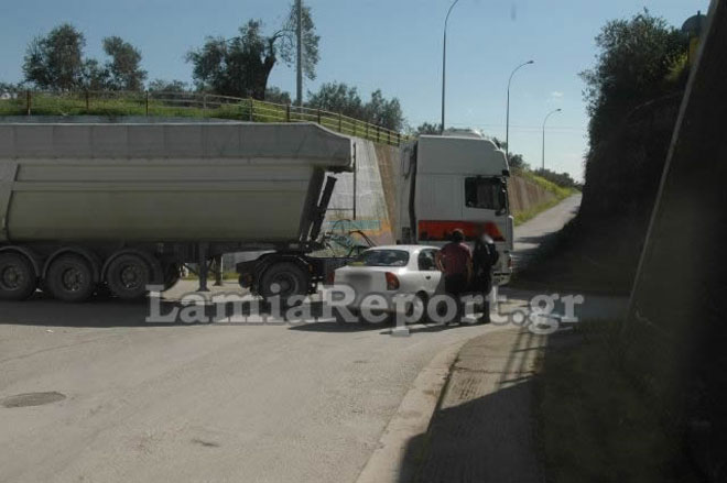 Το λευκό αυτοκίνητο στο οποίο εκτός από τον οδηγό επέβαιναν δυο ακόμη γυναίκες, έπεσε πάνω στη ρόδα του τεράστιου φορτηγού.