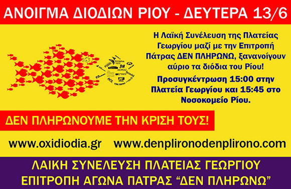 Ειδικότερα, τα μέλη της επιτροπής αγώνα Πάτρας του κινήματος «Δεν πληρώνω» και η Λαϊκή Συνέλευση της Πλατείας σηκώνουν τις μπάρες των διοδίων στην εθνική οδό Αθηνών – Πατρών.
