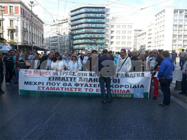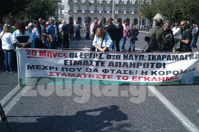 Το σωματείο εργαζομένων στα ναυπηγεία Σκαραμαγκά «Τρίαινα» συγκεντρώθηκε στις 10.00 στην Ομόνοια και με κεντρικό σύνθημα «Φτάνει η κοροϊδία» πραγματοποίησε πορεία σε κεντρικούς δρόμους της πόλης. Αυτήν την ώρα οι εργαζόμενοι βρίσκονται έξω από το Υπουργείο Διοικητικής Μεταρρύθμισης, ενώ αντιπροσωπεία τους συναντάται με εκπροσώπους του υπουργείου.