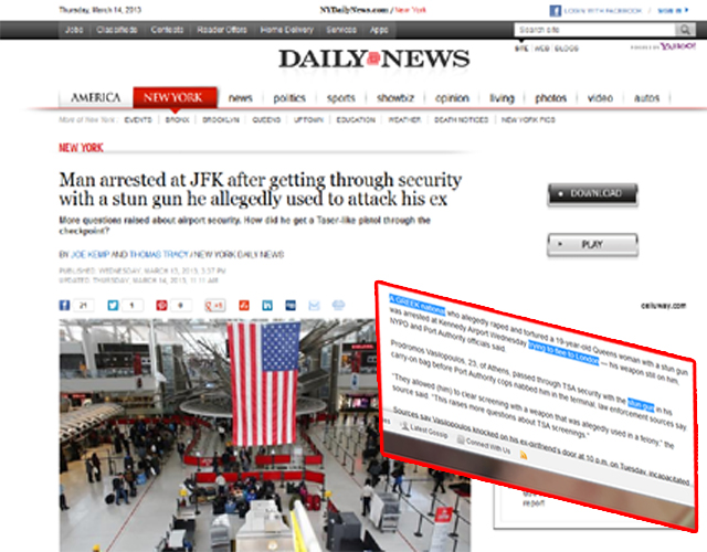 Αναπάντητα παραμένουν τα ερωτήματα για τα επίπεδα ασφαλείας στο διεθνές αεροδρόμιο JFK της Νέας Υόρκης, μετά τη σύλληψη ενός Έλληνα την Τετάρτη ο οποίος κατάφερε να περάσει από τον έλεγχο ένα όπλο τέιζερ.