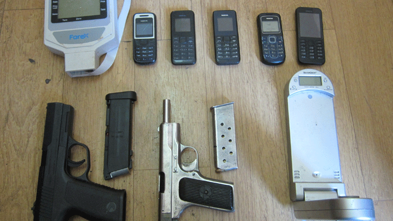 Στη κατοχή του 35χρονου, ο οποίος κατά τη σύλληψή του προέβαλλε σθεναρή αντίσταση, οι αστυνομικοί βρήκαν ένα πιστόλι, το οποίο περιείχε επτά φυσίγγια και ένα κινητό τηλέφωνο, ενώ στη κατοχή των δυο συνεργών του, οι οποίοι εντοπίστηκαν σε άλλο χώρο της φυτείας, βρέθηκαν και κατασχέθηκαν ένα αεροβόλο όπλο και τέσσερα ακόμα κινητά τηλέφωνα.