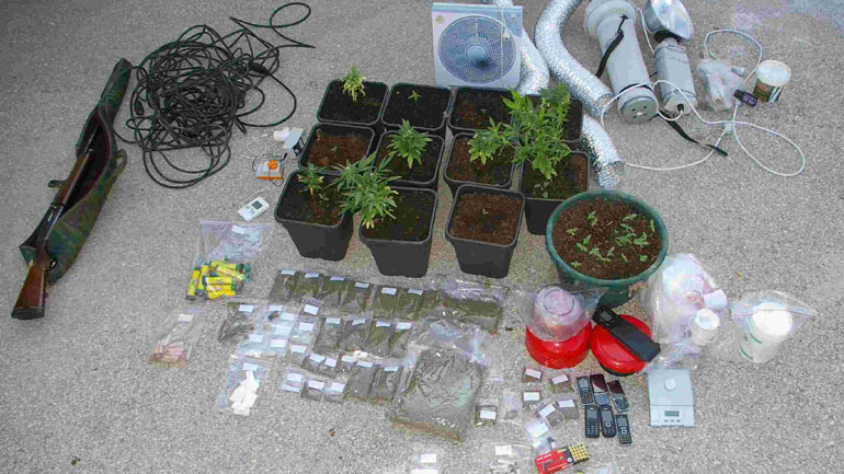 Ειδικότερα, έπειτα από κατάλληλη αξιοποίηση πληροφοριών, οι αστυνομικοί πραγματοποίησαν συντονισμένη επιχείρηση, κατά τη διάρκεια της οποίας εντόπισαν και συνέλαβαν τους τρεις δράστες, διότι σε έρευνες που πραγματοποίησαν, με τη συνδρομή αστυνομικού σκύλου, σε ένα κατάστημα και στα σπίτια τους εντόπισαν μεταξύ άλλων ένα εργαστήριο καλλιέργειας φυτών κάνναβης, ποσότητες ναρκωτικών, μία κυνηγετική καραμπίνα, φυσίγγια και κροτίδες.