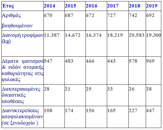 Παρέχει τρόφιμα, ιματισμό, υποδήματα, είδη προσωπικής υγιεινής, πληρωμή ενοικίων, λογαριασμών ΔΕΗ- ΕΥΔΑΠ, σε αποφυλακισμένους και οικογένειες κρατουμένων, λειτουργώντας αποτρεπτικά στην δημιουργία παραβατικής συμπεριφοράς.