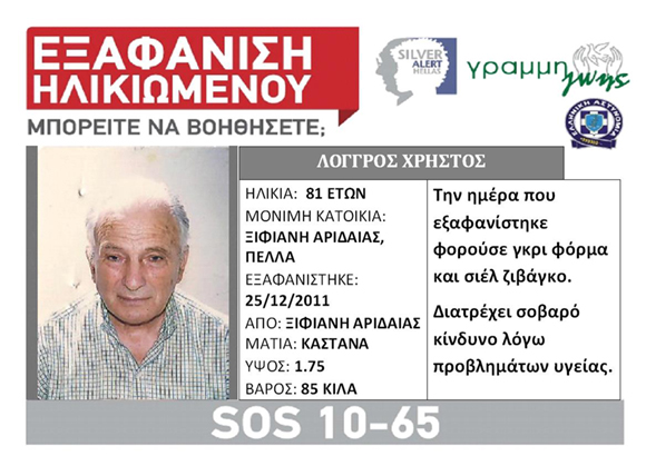 Εξαφανίστηκε στις 25/12/2011 από Ξιφιανή Αριδαίας, είναι 81 ετών και διατρέχει σοβαρό κίνδυνο λόγω προβλημάτων υγείας.
