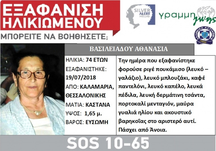 Silver Alert εξέδωσε η Γραμμή Ζωής για την εξαφάνιση γυναίκας στην Καλαμαριά.