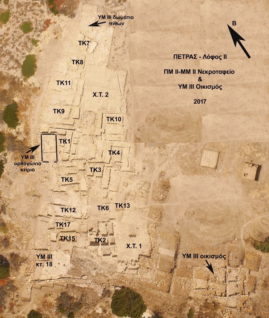 Πρόκειται για την «ανασκαφή του ασύλητου Προ- και Παλαιο-ανακτορικού μινωικού νεκροταφείου Πετρά Σητείας (2800-1800 π.Χ.)», η οποία «συνεχίσθηκε για 12η χρονιά, υπό τη διεύθυνση της επίτιμης διευθύντριας του ΥΠΠΟΑ, δρος Μεταξίας Τσιποπούλου, με εξαιρετικά αποτελέσματα. Ο Πετράς ανασκάπτεται και μελετάται από διεπιστημονική ομάδα 26 ατόμων από εννέα χώρες. Στο νεκροταφείο έχουν μέχρι σήμερα ανασκαφεί 17 μεγάλα ταφικά κτήρια (με εμβαδόν έως 125 τ.μ.), μία ταφική βραχοσκεπή, τρεις λάκκοι και δύο εκτεταμένοι χώροι τελετουργιών, που ανεγέρθηκαν και χρησιμοποιήθηκαν από εξέχουσες οικογένειες του ανακτορικού οικισμού. Οι ταφές είναι δευτερογενείς, με επτά μόνον εξαιρέσεις πρωτογενών» σημειώνει το ΥΠΠΟΑ.