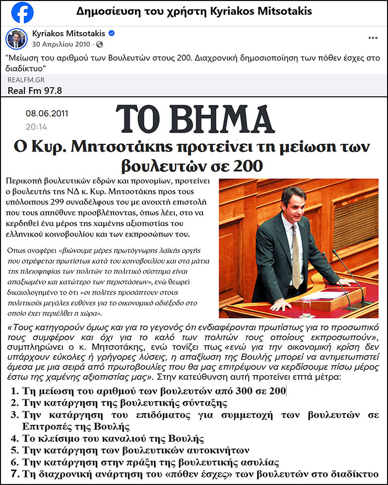 Β. Το 2011 ο Κυριάκος Μητσοτάκης με ανοικτή επιστολή που απηύθυνε στους υπόλοιπους 299 βουλευτές (https://www.tovima.gr/2011/06/08/politics/o-kyr-mitsotakis-proteinei-ti-meiwsi-twn-boyleytwn-se-200/), πρότεινε την περικοπή των βουλευτικών εδρών και των προνομίων των βουλευτών, για να κερδηθεί ένα μέρος της χαμένης αξιοπιστίας του ελληνικού κοινοβουλίου και των εκπροσώπων του, αναφέροντας: