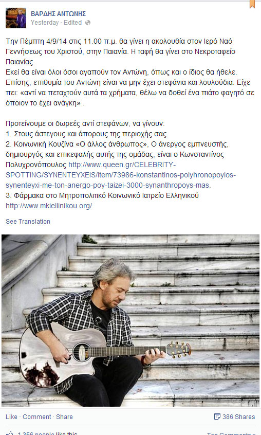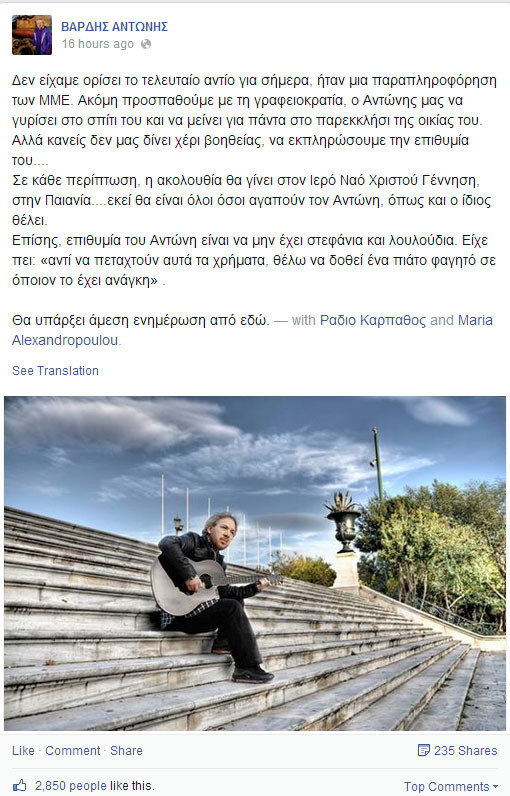 Δείτε την ανακοίνωση που αναρτήθηκε στην επίσημη ιστοσελίδα του Αντώνη Βαρδή στο Facebook