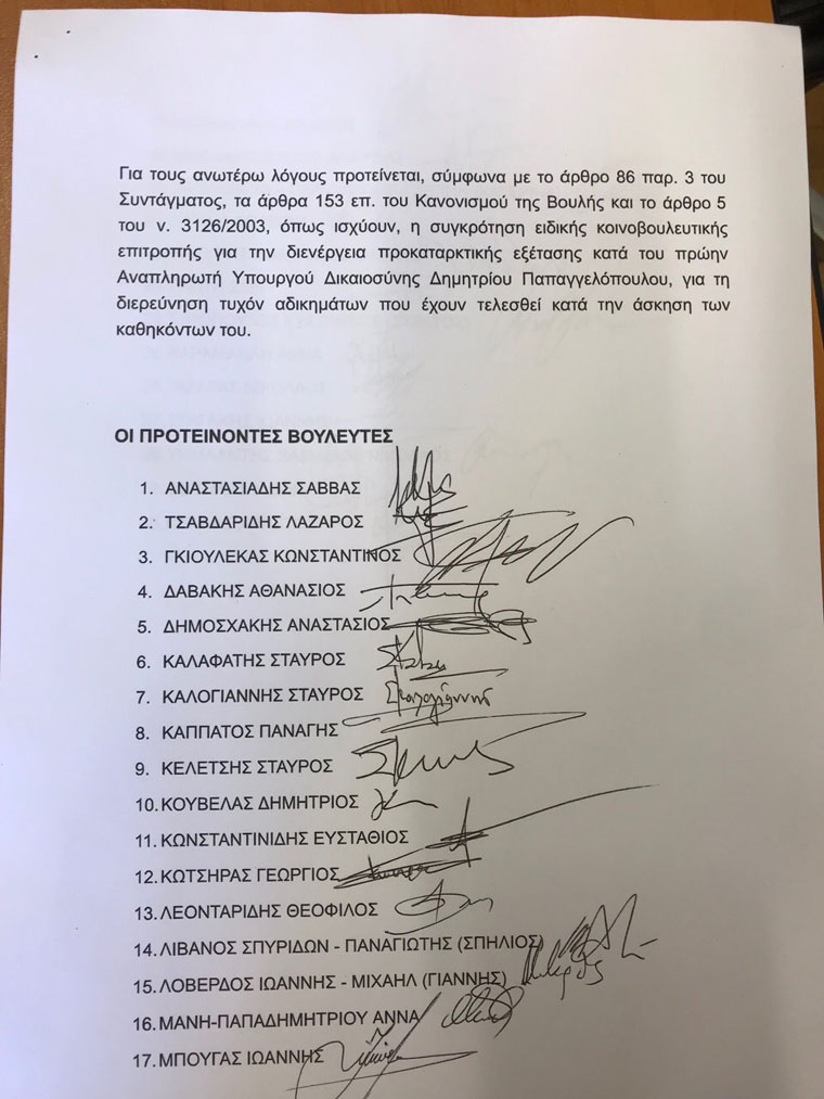 Έτοιμη είναι η πρόταση συγκρότησης προανακριτικής επιτροπής για τον πρώην αναπληρωτή υπουργό Δικαιοσύνης Δημήτρη Παπαγγελόπουλο, καθώς οι βουλευτές της Νέας Δημοκρατίας έχουν υπογράψει και ήδη η πρόταση κατατέθηκε στη Βουλή.