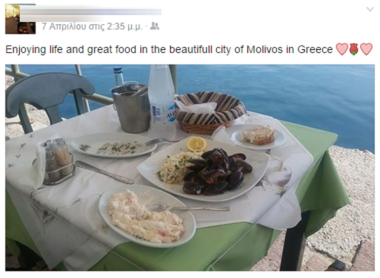 Ο καταγγέλλων ερωτά εάν τα χρήματα αυτά πάνε τελικά στους πρόσφυγες, ενώ παράλληλα καυτηριάζει τον τρόπο ζωής της κας Μ.Η., η οποία απολαμβάνει τον θαλασσινό αέρα, συνοδεία καλού ούζου (φημίζεται η Μυτιλήνη) και… εδεσμάτων, όπως η αστακοκαραβίδα…