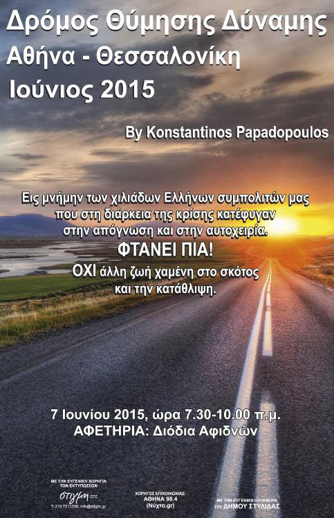 Έτοιμος να τερματίσει τρέχοντας τη συμβολική διαδρομή Αθήνα-Θεσσαλονίκη, εις μνήμην όλων αυτών που οδηγήθηκαν στην αυτοκτονία εξαιτίας της κρίσης τα τελευταία χρόνια, είναι ο Κωνσταντίνος Παπαδόπουλος, που αναμένεται το απόγευμα της Δευτέρας να εισέλθει στη Θεσσαλονίκη, με συνοδεία αστυνομικού οχήματος.