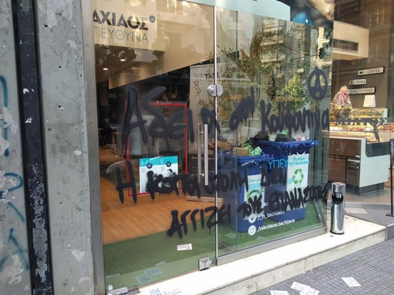 «Πόλεμος στο κράτος και το κεφάλαιο» γράφει σύνθημα έξω από το εκλογικό κέντρο της Κατερίνας Νοτοπούλου. «Άδεια στον Κουφοντίνα. Η καταστολή δεν αγγίζει τους επαναστάτες» έγραψαν άγνωστοι στο γραφείο του κ. Ταχιάου.