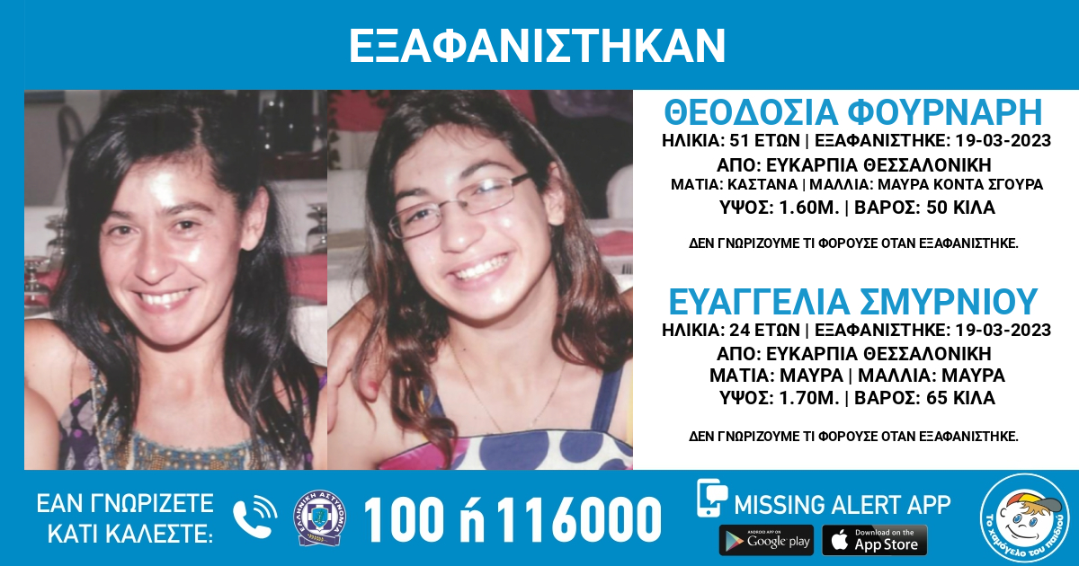 Στις 19.03.2023, άγνωστη ώρα, εξαφανίστηκαν από την περιοχή της Θεσσαλονίκης η Θεοδοσία Φούρναρη, 51 ετών και η Ευαγγελία Σμυρνιού, 24 ετών. Το «Χαμόγελο του Παιδιού» ενημερώθηκε για την εξαφάνιση και προχώρησε στη δημοσιοποίηση των στοιχείων των ενηλίκων, σήμερα, 03.04.2023, κατόπιν αιτήματος της οικογένειας τους, καθώς υπάρχουν σοβαρές ενδείξεις ότι η ζωή τους βρίσκεται σε κίνδυνο.