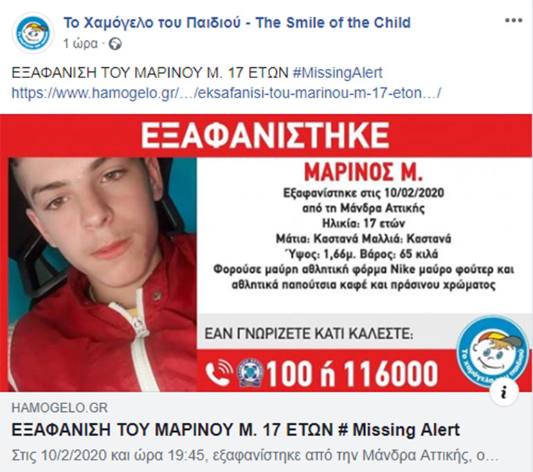 Το Χαμόγελο του Παιδιού ενημερώθηκε σήμερα, Πέμπτη, και προχώρησε άμεσα στη δημοσιοποίηση των στοιχείων του ανήλικου που εξαφανίστηκε στη Μάνδρα.