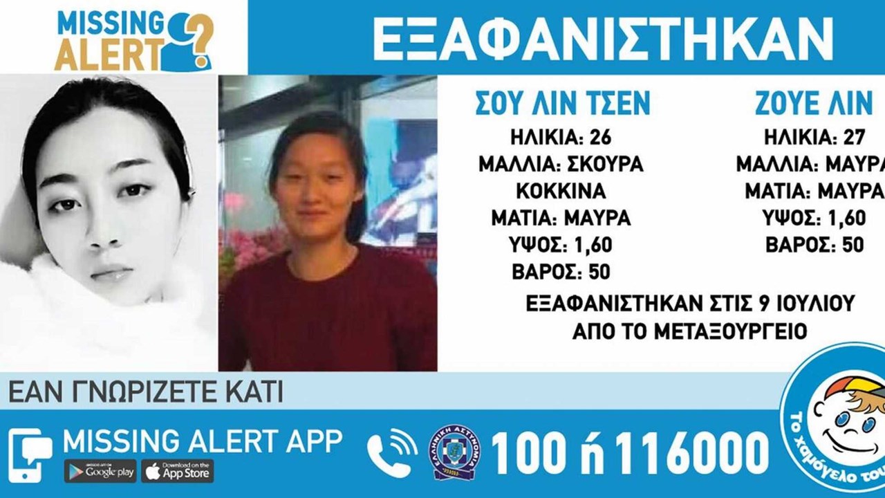 «Την Παρασκευή 09 Ιουλίου 2021 κατά τις πρωινές ώρες, εξαφανίστηκαν από την περιοχή του Μεταξουργείου, η Λιν (επ..) Ζουε (ον.), 27 ετών και η Τσεν (επ.) Σου Λιν (ον.) 26 ετών, κινεζικής καταγωγής. Η μέχρι τώρα διερεύνηση της υπόθεσης δείχνει ότι οι δυο γυναίκες βρίσκονται σε σοβαρό και άμεσο κίνδυνο, και απαιτείται η κινητοποίηση όλων για την εύρεσή τους.