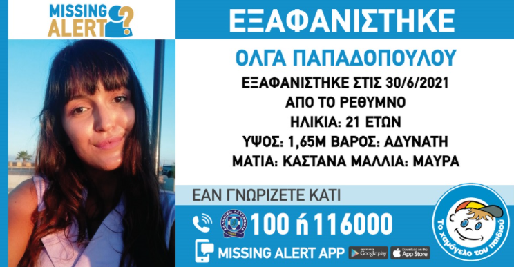 Για την 21χρονη έχει εκδοθεί Missing Alert με το Χαμόγελο του Παιδιού να αναφέρει: «Στις 30 Ιουνίου 2021 εξαφανίστηκε από την περιοχή του Ρεθύμνου, η Όλγα Παπαδοπούλου, 21 ετών.