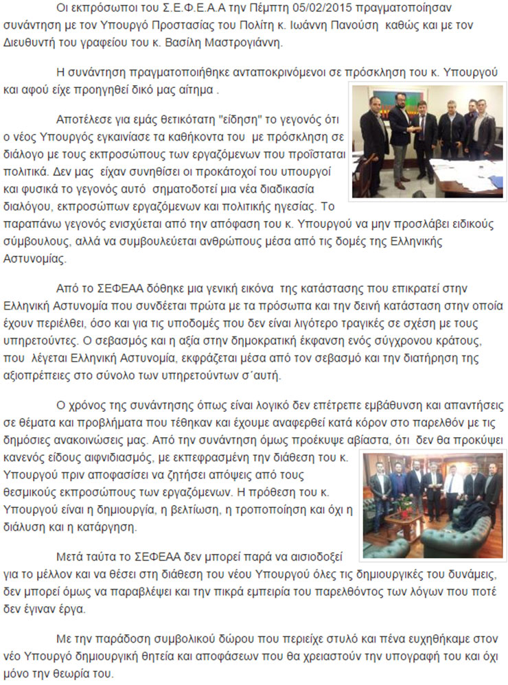 Συνάντηση με τον Υπουργό Προστασίας του Πολίτη κ. Ιωάννη Πανούση καθώς και με τον Διευθυντή του γραφείου του κ. Βασίλη Μαστρογιάννη πραγματοποίησαν την περασμένη Πέμπτη οι εκπρόσωποι του Σ.Ε.Φ.Ε.Α.Α.