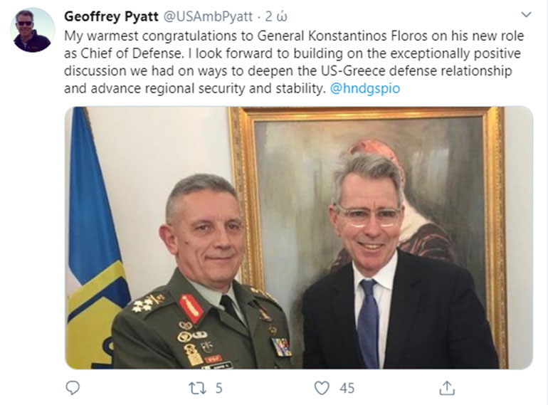 Με τον πρέσβη των ΗΠΑ στην Ελλάδα Τζέφρι Πάιατ συναντήθηκε ο Στρατηγός Κωνσταντίνος Φλώρος, με την ευκαιρία της ανάληψης των καθηκόντων του ως Αρχηγού ΓΕΕΘΑ, όπως αναφέρει σχετική ανακοίνωση του ΓΕΕΘΑ.
