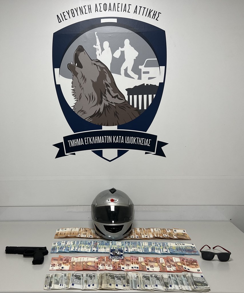 Ειδικότερα ο ανωτέρω, λίγο πριν τη σύλληψη του, έχοντας καλυμμένα τα χαρακτηριστικά του προσώπου, του εισήλθε σε κατάστημα τράπεζας στην περιοχή του Κολωνού Αττικής και με την απειλή όπλου αφαίρεσε από το ταμείο χρηματικό ποσό.