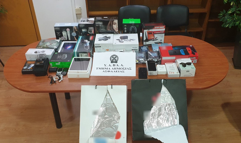 Σε έρευνες που πραγματοποιήθηκαν, σε (2) οικίες που διατηρούσε στο Γαλάτσι, καθώς και στη μοτοσυκλέτα που χρησιμοποιούσε, βρέθηκαν και κατασχέθηκαν, σακούλα στην οποία είχε τοποθετήσει περιμετρικά πολλαπλές στρώσεις αλουμινίου, σακούλες καταστημάτων και πλήθος κλοπιμαίων ηλεκτρονικών συσκευών, κινητών τηλεφώνων και ειδών ρουχισμού.