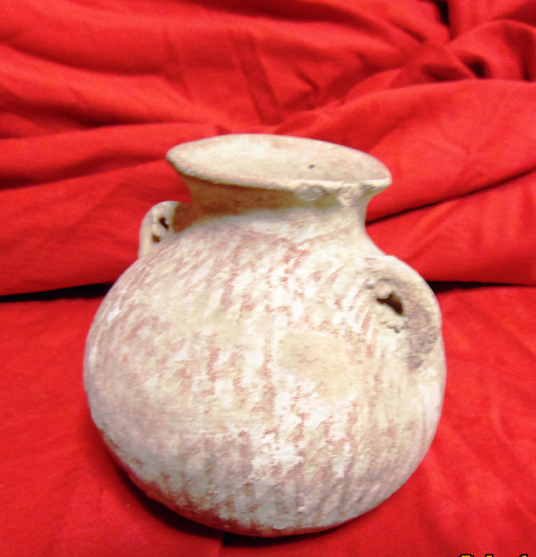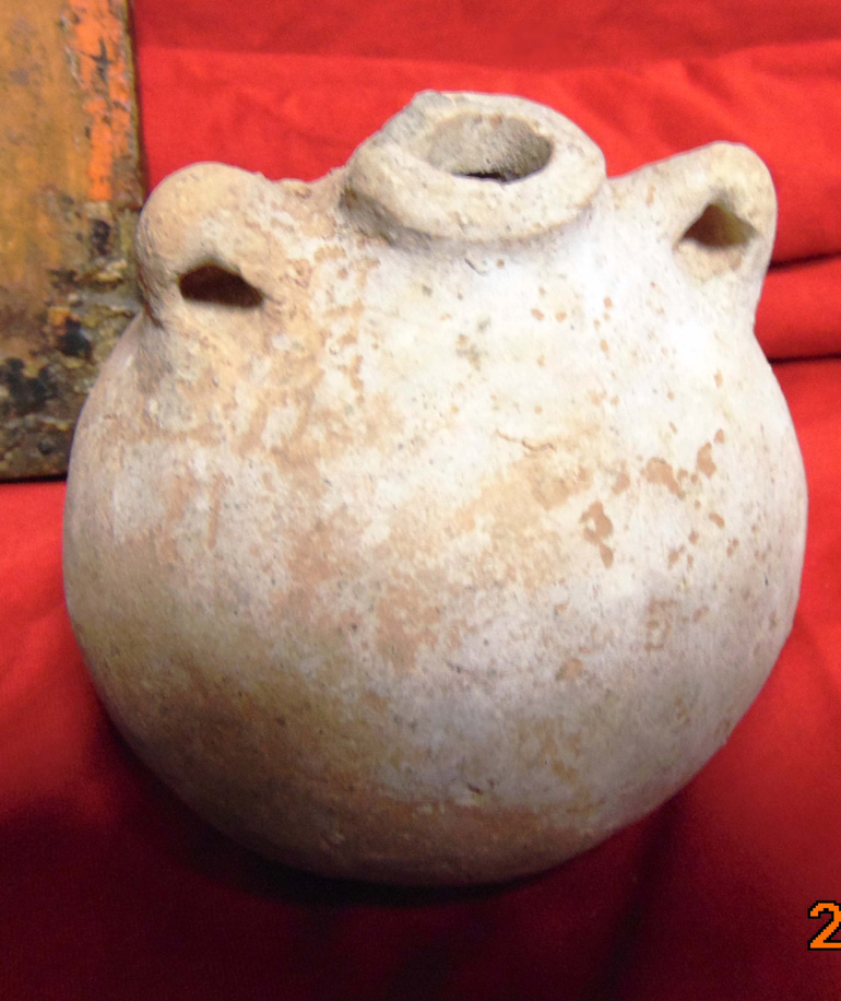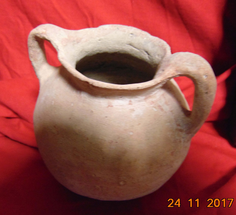 • (2) Πήλινοι χειροποίητοι αμφορίσκοι (1) εκ των οποίων με γραπτή διακόσμηση (πιθανώς ύστερης εποχής του χαλκού)