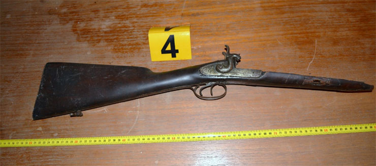 • ένα (1) κοντόκανο εμπροσθογεμές τυφέκιο τύπου «καριοφίλι» μήκους 96 εκατοστών χρώματος ασημί-μαύρο ξεθωριασμένο που φέρει επί του σώματος ανάγλυφες παραστάσεις και τις ενδείξεις μεταξύ άλλων «γνίγ 30» ενώ στο κοντάκι του φέρει ανάγλυφη παράσταση αετού,